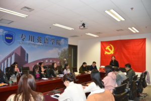 2017年12月20日中午,BB贝博艾弗森直属党支部于西校区综合楼1016室召开预备党员转正大会,讨论关于2017级MTI硕士生段雅雯同志、杨帆同志和韩静伟同志申请转为正式党员的问题。出席本次大会的同志有学院直属党支部书记李莉文同志、副书记蔡鸿同志、党支部其他委员,以及党支部其他教师和学生党员共29人。本次大会由程熙旭老师和仵胜奇老师主持。本次出席会议的有表决权的党员有26人,其中学生10人,教师党员16人,超过本支部有表决权党员半数,符合人数规定。转正大会共分四项议程。