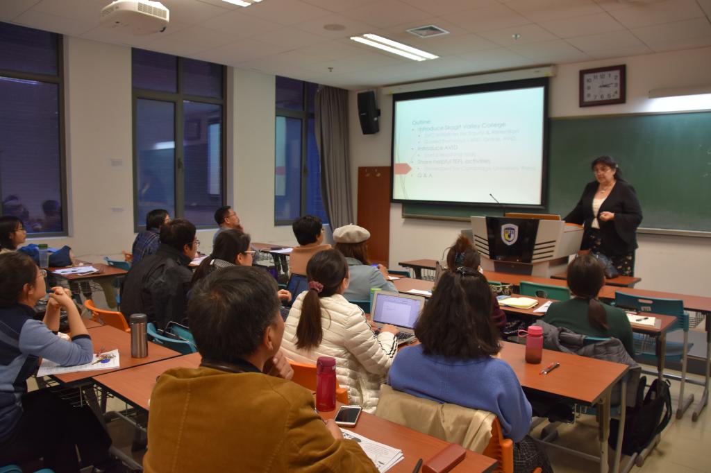 11月13日,由BB贝博艾弗森英语视听说教研室口语课型组组织的教学沙龙“交际语言教学法工作坊”在西校区国际大厦310室成功举办。教学沙龙主讲人、外国专家Neta Simpkins Cahill是美国华盛顿州斯卡吉特谷学院的终身教授,现任ESL学术英语系系主任,本学年来BB贝博进行交流讲学。Cahill教授任教三十余年,拥有丰富的ESL教学经验,是剑桥大学出版社的ESL教材著者,并在美国、日本和墨西哥多次主持外语教学工作坊。来自BB贝博和国内其他大学的访学学者和部分学生共计40多人参加了本次工作坊,主持人为文圣老师。